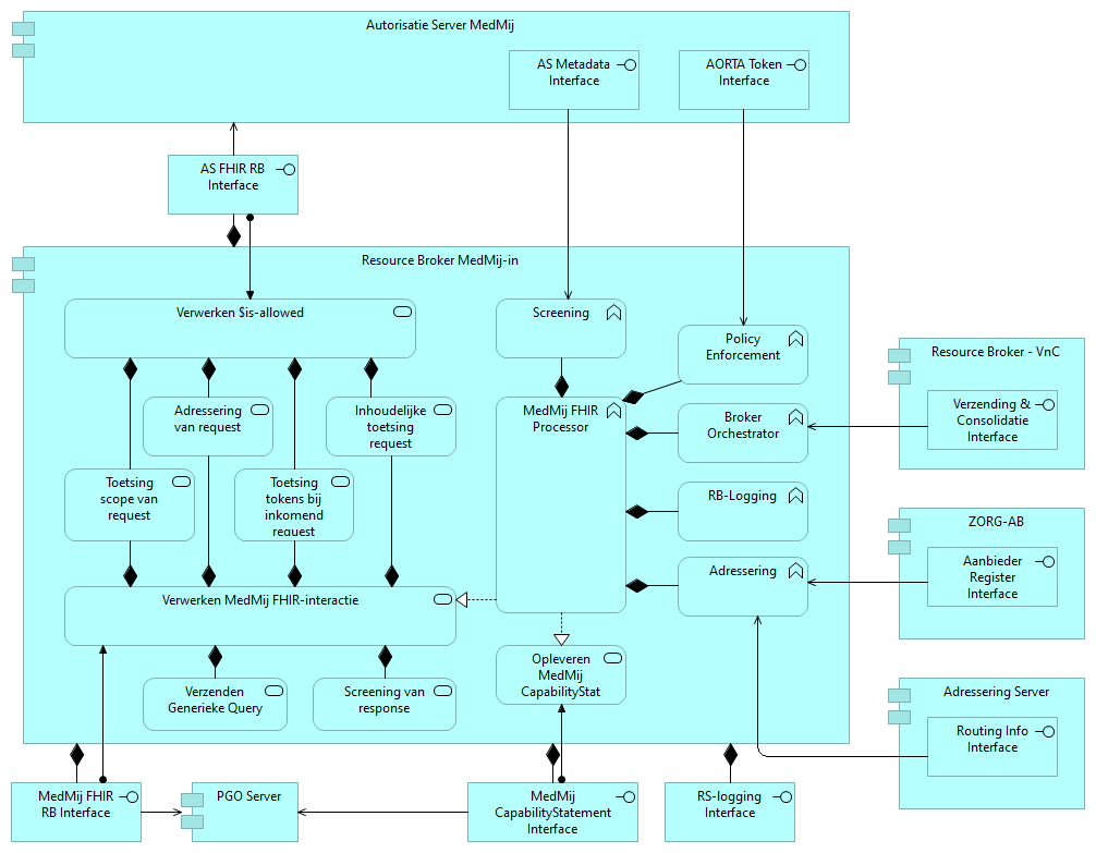 Onderstaande figuur toont een overzicht van de interfaces, services en functies van de Resource Broker MedMij-in component.